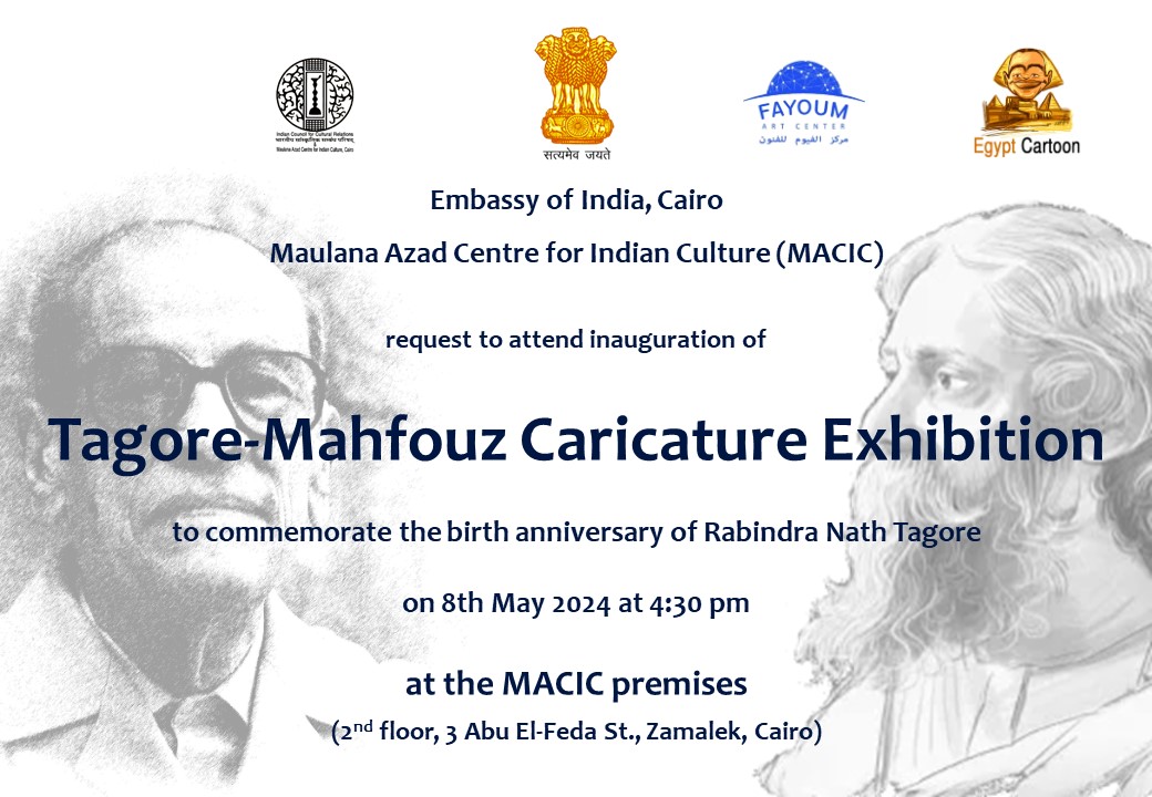 4. ويفتتح معرض طاغور – محفوظ للكاريكاتير سعادة سفير الهند بالقاهرة السيد/ أجيت جوبتيه وذلك في مقر مركز مولانا آزاد الثقافي الهندي بالزمالك، يوم 8 مايو 2024 الساعة 4:30 مساءً.