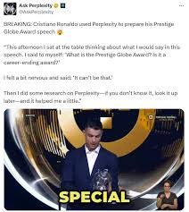 لجأ أسطورة كرة القدم كريستيانو رونالدو مؤخرًا إلى الذكاء الاصطناعي للمساعدة في البحث وكتابة خطابه قبل فوزه بجائزة جلوب بريستيج في حفل جوائز البرتغال لكرة القدم.