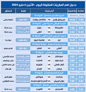 نقدم إليكم جدولاً لأبرز مباريات اليوم الإثنين، الموافق 6 مايو/ أيار 2024