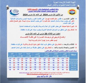 لفتت الأرصاد إلى أنه اعتبارا من يوم الثلاثاء 26 مارس إلى الأحد 31 من الشهر ذاته، تشهد حالة الطقس ارتفاعًا تدريجيًا في درجات الحرارة على كافة الأنحاء؛ ليسود طقس حار نهارًا مائل للبرودة ليلًا.