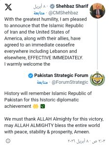 وأشار شريف إلى أن الطرفين أظهرا “حكمة وتفهما لافتين” وظلا ملتزمين بـ”تعزيز قضية السلام والاستقرار”، معرباً عن أمله في أن تنجح محادثات إسلام آباد في تحقيق “سلام مستدام”، وأن يُعلن المزيد من الأخبار الإيجابية لاحقاً.