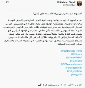 أرحب بحرارة بهذه اللفتة الحكيمة وأتقدم بأعمق الشكر لقيادة كلا البلدين، وأدعو وفودها إلى إسلام آباد يوم الجمعة، 10 أبريل/نيسان 2026، للتفاوض الإضافي من أجل اتفاق نهائي يحل جميع النزاعات.”