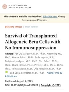 هذا سمح بزرعها بدون أي مثبطات مناعية، وهو أمر لم يحدث من قبل في تاريخ الطب. الدراسة نشرت في 4 أغسطس 2025 في مجلة NEJM بعنوان “Survival of Transplanted Allogeneic Beta Cells with No Immunosuppression” (DOI: 10.1056/NEJMoa2503822).