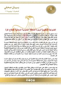 في سياق متصل، ونظراً لتزايد الطلبات والاستفسارات من وفود أجنبية (حقوقيين، برلمانيين، إعلاميين، وممثلي منظمات غير حكومية) لزيارة المنطقة الحدودية المحاذية لقطاع غزة، وبالأخص مدينة العريش ومعبر رفح، أكدت مصر على ضرورة الالتزام بالضوابط التنظيمية الموضوعة منذ بدء الأزمة في غزة. تشمل هذه الضوابط: