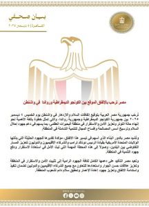 وأشادت مصر بالدور الإقليمي والدولي الذي ساهم في إنجاح عملية التوقيع، مؤكدة تقديرها للجهود التي بذلتها الأطراف المختلفة لدعم محادثات السلام، وتركيزها على ضرورة الالتزام بما تم الاتفاق عليه لضمان تحقيق نتائج ملموسة على الأرض.