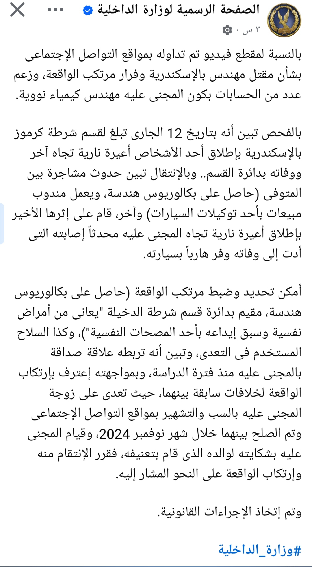 بياناً رسمياً من وزارة الداخلية المصرية